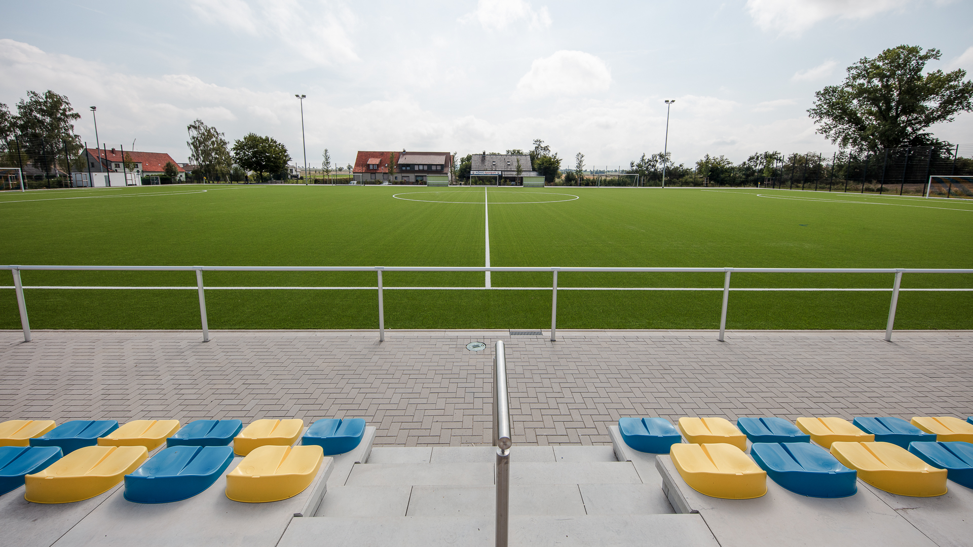 Laufbahn und Kunstrasenspielfeld sind durch einen Zuschauerbereich getrennt, der nicht nur eine Pflasterfläche, sondern eine zweistufige, 35 Meter lange Sitzstufenanlage und Sitzblöcke aus Beton beheimatet. Die Stufenanlage ist beidseitig nutzbar und zum Spielfeld hin schmücken 40 Sitzschalen in blau und gelb die kleine Tribüne. Für eine gleichmäßige Beleuchtung in den Abendstunden sorgt die neuinstallierte und energiesparende LED-Flutlichtanlage mit vier Masten.