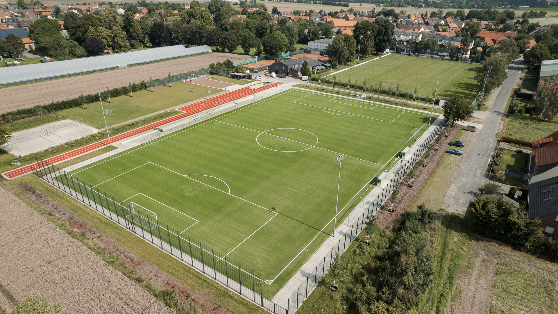 Das Herzstück der Sportanlage bildet ohne Frage das 6.720 Quadratmeter große Kunstrasenspielfeld. Dieses ist mit einem Kombinationsbelag aus geraden und texturierten Fasern ausgestattet und mit Quarzsand verfüllt. „Das Kunstrasenfeld bekommt Bestnoten von unseren Fußballspielern. Weicher, gelenkschonender Untergrund, gutes Roll- und Sprungverhalten des Balles und Sand ist besser als Gummigranulat“, lautet das Urteil des MTV Salzdahlum. Für den zuverlässigen Kraftabbau zeichnet sich die im Ortseinbau erstellte elastische Tragschicht verantwortlich.