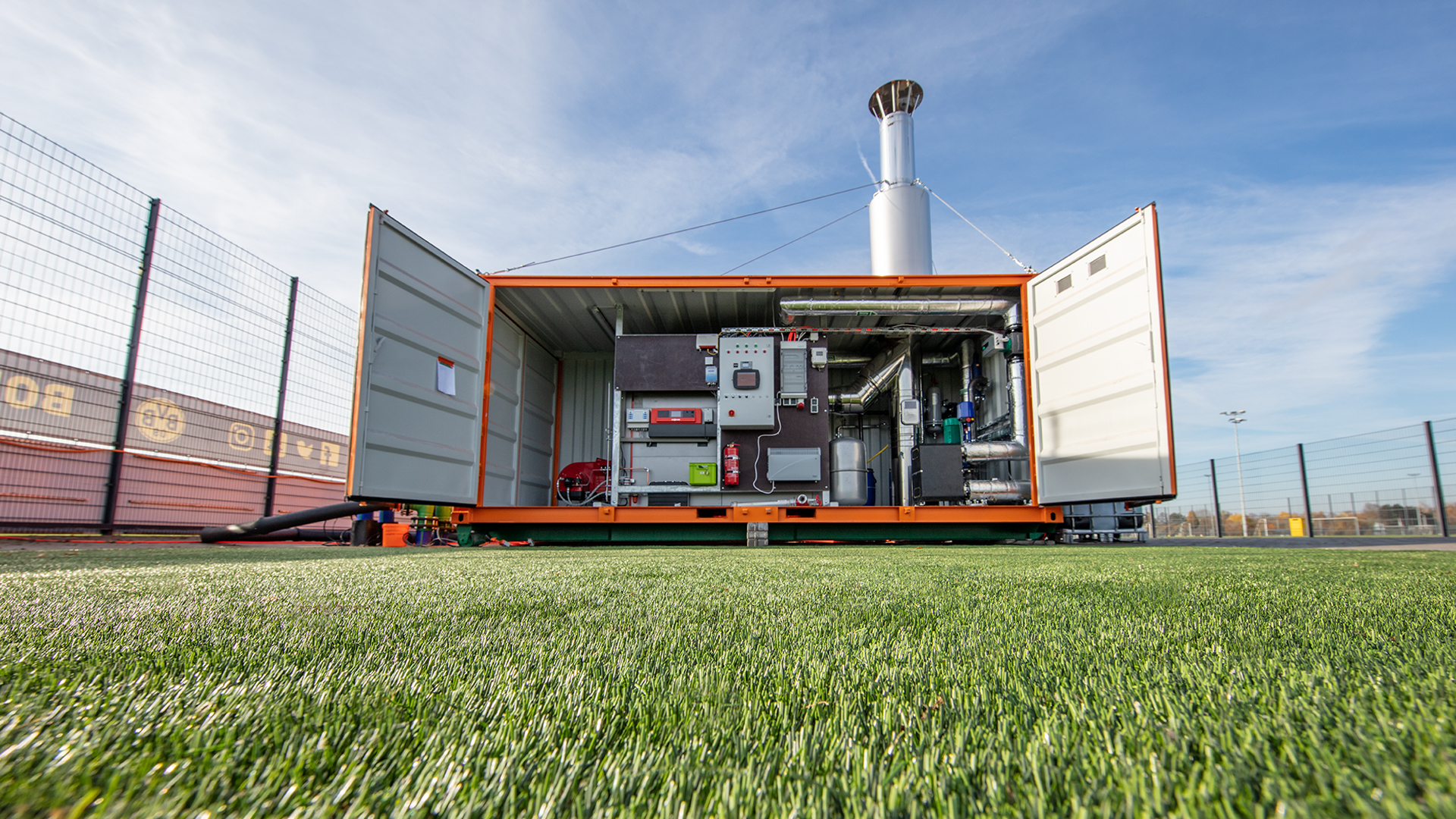 heiler hat mit der Sportheat Heizanlage eine mobile Lösung entwickelt, die immer und überall funktioniert. Voraussetzung für die Installation und Inbetriebnahme sind lediglich eine befestigte Stellfläche für ein bis zwei 20“-Container sowie ein 32 A-Stromanschluss. Aufbau und Anschluss der mobilen Heizanlage selbst dauern nur drei Tage. Mittels Fernwärme oder Heizöl, das unauffällig in Batterietanks in einem separaten Container gelagert wird, erzeugt die Heizanlage eine Nennleistung von 1,2 MW. Zusammen mit einer Förderleistung von 60 m³/h kann eine Einheit der mobilen Heizanlage ein gesamtes Großspielfeld von 105 x 68 m beheizen.
