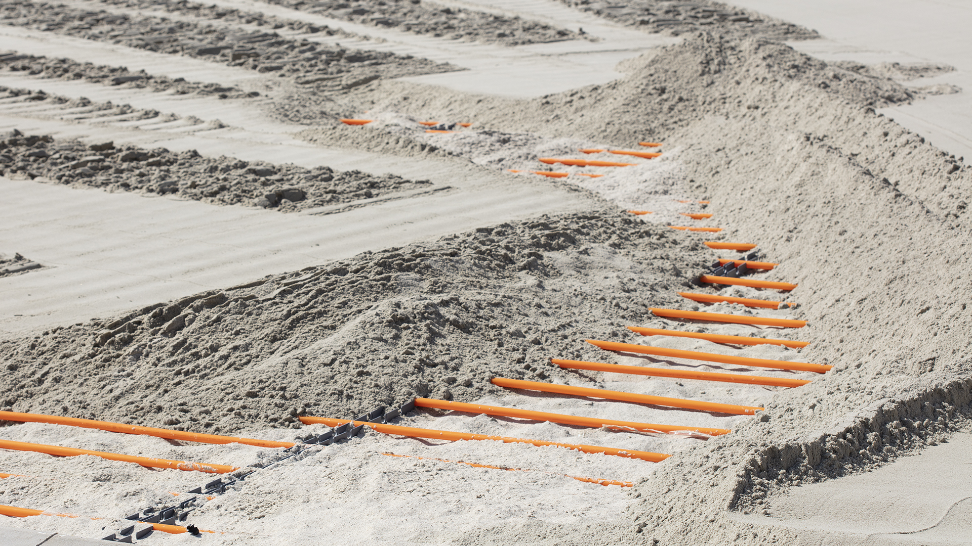 Borussia Dortmund verfügt ab sofort neben einem beheizten Hybridrasen-Trainingsplatz und einem beheizten Kunstrasenplatz über einen dritten winterfesten Trainingsplatz mit Naturrasen. Während der Sommervorbereitung hat die heiler GmbH & Co. KG auf dem Trainingsgelände in Dortmund Brackel Platz 3 mit einer Rasenheizung aufgerüstet. Dazu wurden auf einer Fläche von 8.400 m² zunächst die alte Grasnarbe abgeschält sowie die Rasentragschicht und Dränschicht abgetragen. Die Installation der neuen Rasenheizung erfolgte auf einem neu erstellten Grundplanum. Alle 30 cm verläuft eine Heizschlaufe, sodass die Gesamtlänge aller Heizrohre ganze 28 Kilometer beträgt! Durch die Rohre fließen künftig etwa 15.000 Liter Frost- und Korrosionsschutzmittel. Auf der fertig verlegten Rasenheizung wurden anschließend die Dränschicht sowie die untere und obere Rasentragschicht wiederhergestellt. Zum Abschluss hat die Fa. Hendriks Graszoden einen hochwertigen Naturrasen als Dicksode verlegt.