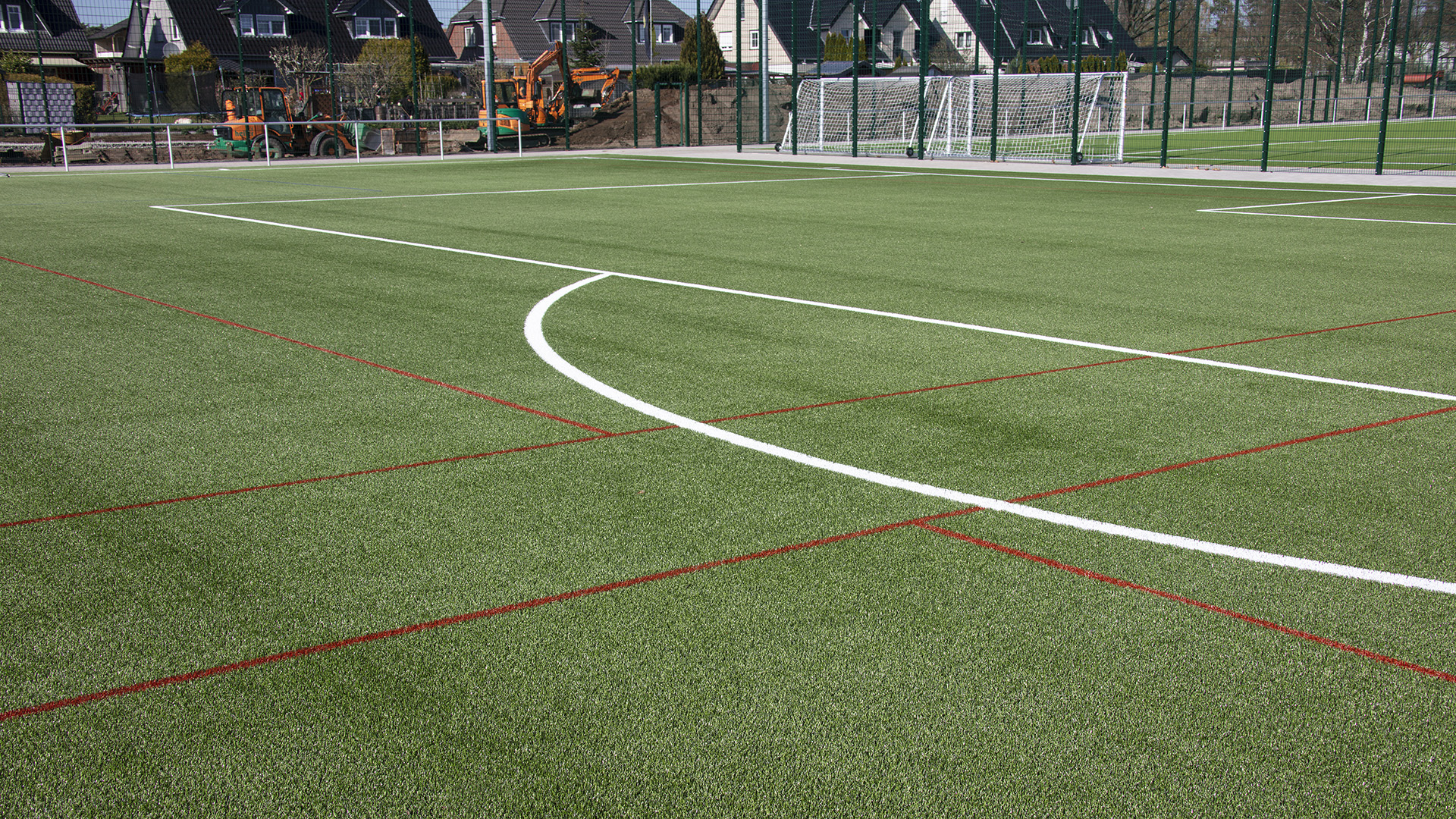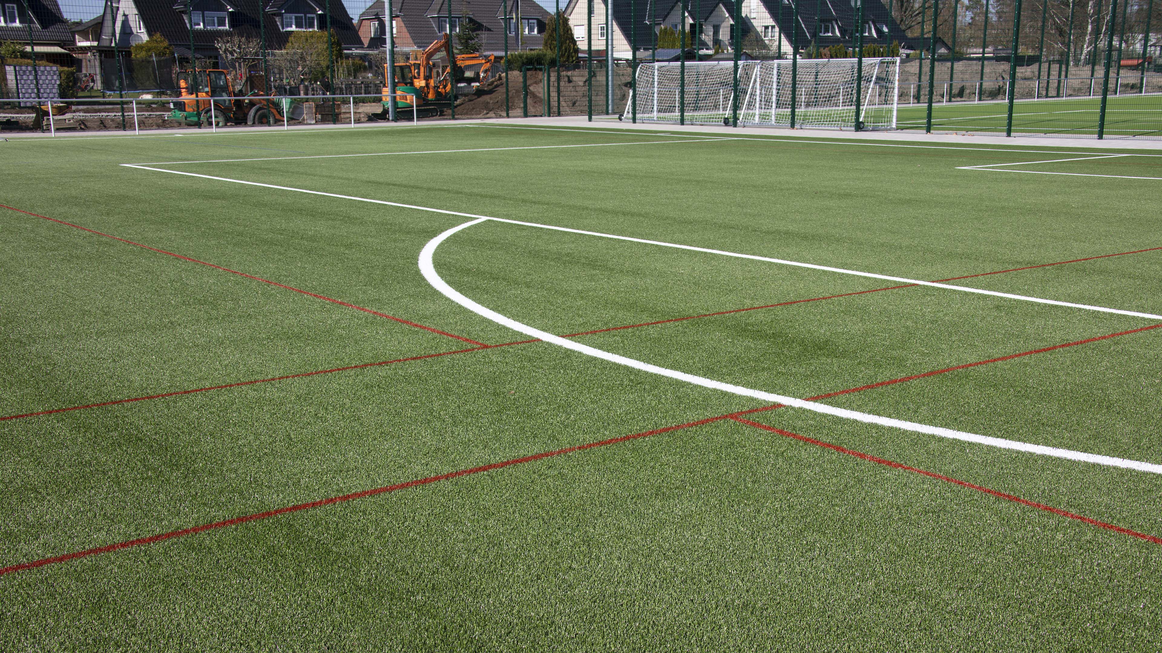 Dem neuen Großspielfeld ist seine besondere Bestimmung direkt anzusehen: neben den weißen Linien des klassischen Fußballfelds und schmalen, blauen Markierungen für den Jugendfußball trägt es zwei in Rot eingearbeitete Spielfelder für Ultimate Frisbee. Hier in Verl hat die ungewöhnliche, aber aufstrebende Sportart seit letztem Jahr ihren Landesstützpunkt in NRW. Damit spielt die Stadt Verl ganz vorn mit: Es handelt sich bundesweit erst um den vierten derartigen Platz neben Darmstadt, Leipzig und Berlin.